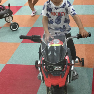 仮面ライダーのバイクみたいと大喜びなお兄ちゃん。