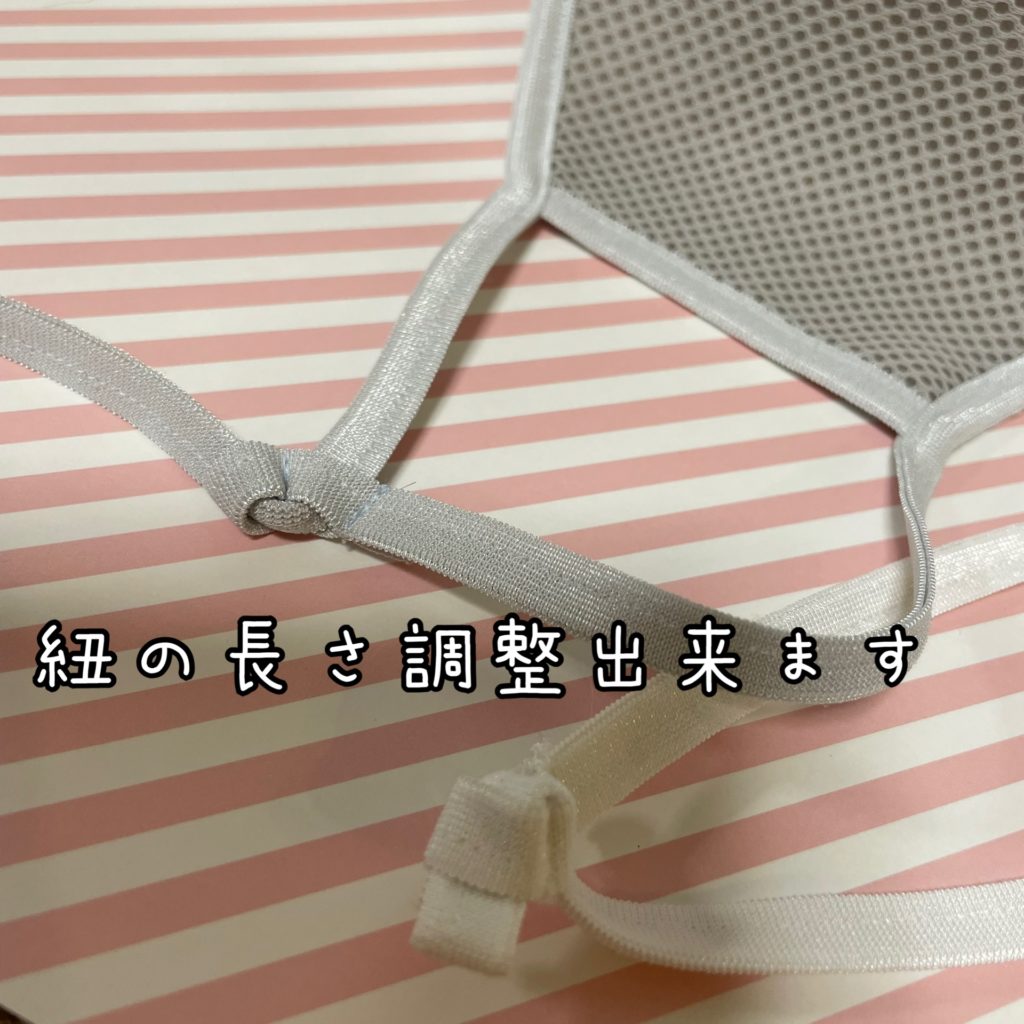 紐の長さも調節可能。固定するパーツはありませんが、洗濯機で洗濯してもちゃんと長さキープしてくれます。