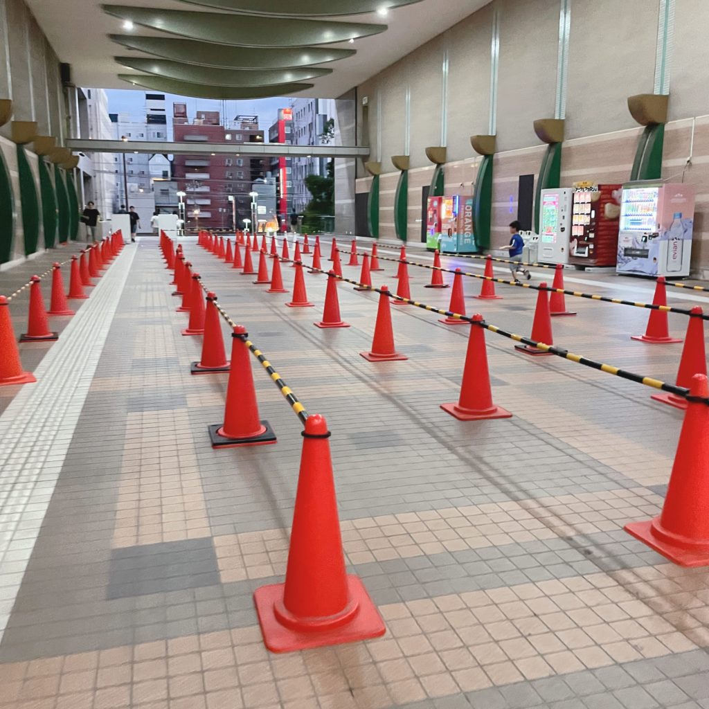 三角コーンと棒で並び列が設置されていて、家族連れがずらーっと…。30分程並んでようやく館内でチケットを購入出来ました。